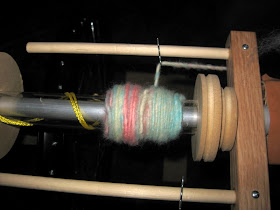 I have me a yarn spinning instructor!!... Her name is Pat Miller... she owns Taming of the Ewe in Jacksonville, Al... she teaches knitting and crocheting and spinning all for free!!.. imagine that!!... she is the best and I love her already!... I love all the wonderful yarns there are to choose from. I learned so much from her on the first day.  She even encourages me on Facebook.  I love Taming of the Ewe...if you ever want to knit or crochet... or spin ... and a friendly place to buy beautiful yarn this is the place to go!!  Here is my second attempt on my wheel!!... she says I am a natural!! How much fun is that!! I am going to 2 ply this yarn on Saturday!